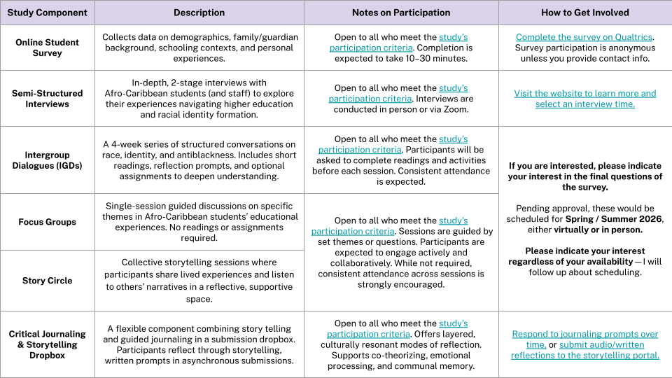 The study invites Afro-Caribbean-identifying students to participate in one or more of the following components: